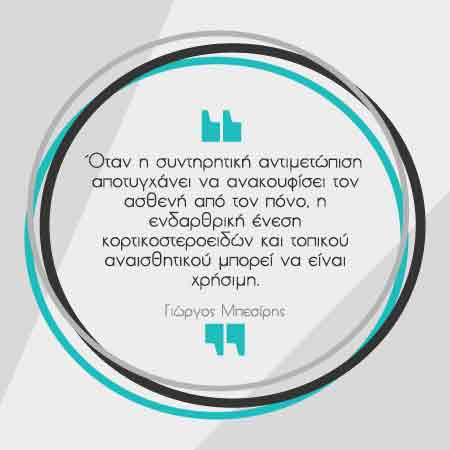 Όταν η συντηρητική αντιμετώπιση αποτυγχάνει να ανακουφίσει τον ασθενή από τον πόνο, η ενδαρθρική ένεση κορτικοστεροειδών και τοπικού αναισθητικού μπορεί να είναι χρήσιμη.